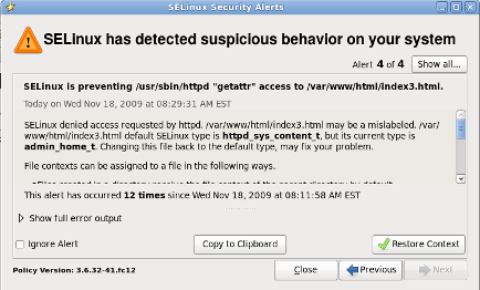 $ sealert -l 84e0b04d-d0ad-4347-8317-22e74f6cd020 Summary: SELinux is preventing httpd (httpd_t) "getattr" to /var/www/html/file1 (samba_share_t). Detailed Description: SELinux denied access to /var/www/html/file1 requested by httpd. /var/www/html/file1 has a context used for sharing by different program. If you would like to share /var/www/html/file1 from httpd also, you need to change its file context to public_content_t. If you did not intend to this access, this could signal a intrusion attempt. Allowing Access: You can alter the file context by executing chcon -t public_content_t '/var/www/html/file1' Fix Command: chcon -t public_content_t '/var/www/html/file1' Additional Information: Source Context unconfined_u:system_r:httpd_t:s0 Target Context unconfined_u:object_r:samba_share_t:s0 Target Objects /var/www/html/file1 [ file ] Source httpd Source Path /usr/sbin/httpd Port <Unknown> HosthostnameSource RPM Packages httpd-2.2.10-2 Target RPM Packages Policy RPM selinux-policy-3.5.13-11.fc12 Selinux Enabled True Policy Type targeted MLS Enabled True Enforcing Mode Enforcing Plugin Name public_content Host NamehostnamePlatformLinux hostname 2.6.27.4-68.fc12.i686 #1 SMP Thu Oct30 00:49:42 EDT 2008 i686 i686 Alert Count 4 First Seen Wed Nov 5 18:53:05 2008 Last Seen Wed Nov 5 01:22:58 2008 Local ID 84e0b04d-d0ad-4347-8317-22e74f6cd020 Line Numbers Raw Audit Messages node=hostnametype=AVC msg=audit(1225812178.788:101): avc: denied { getattr } for pid=2441 comm="httpd" path="/var/www/html/file1" dev=dm-0 ino=284916 scontext=unconfined_u:system_r:httpd_t:s0 tcontext=unconfined_u:object_r:samba_share_t:s0 tclass=file node=hostnametype=SYSCALL msg=audit(1225812178.788:101): arch=40000003 syscall=196 success=no exit=-13 a0=b8e97188 a1=bf87aaac a2=54dff4 a3=2008171 items=0 ppid=2439 pid=2441 auid=502 uid=48 gid=48 euid=48 suid=48 fsuid=48 egid=48 sgid=48 fsgid=48 tty=(none) ses=3 comm="httpd" exe="/usr/sbin/httpd" subj=unconfined_u:system_r:httpd_t:s0 key=(null)